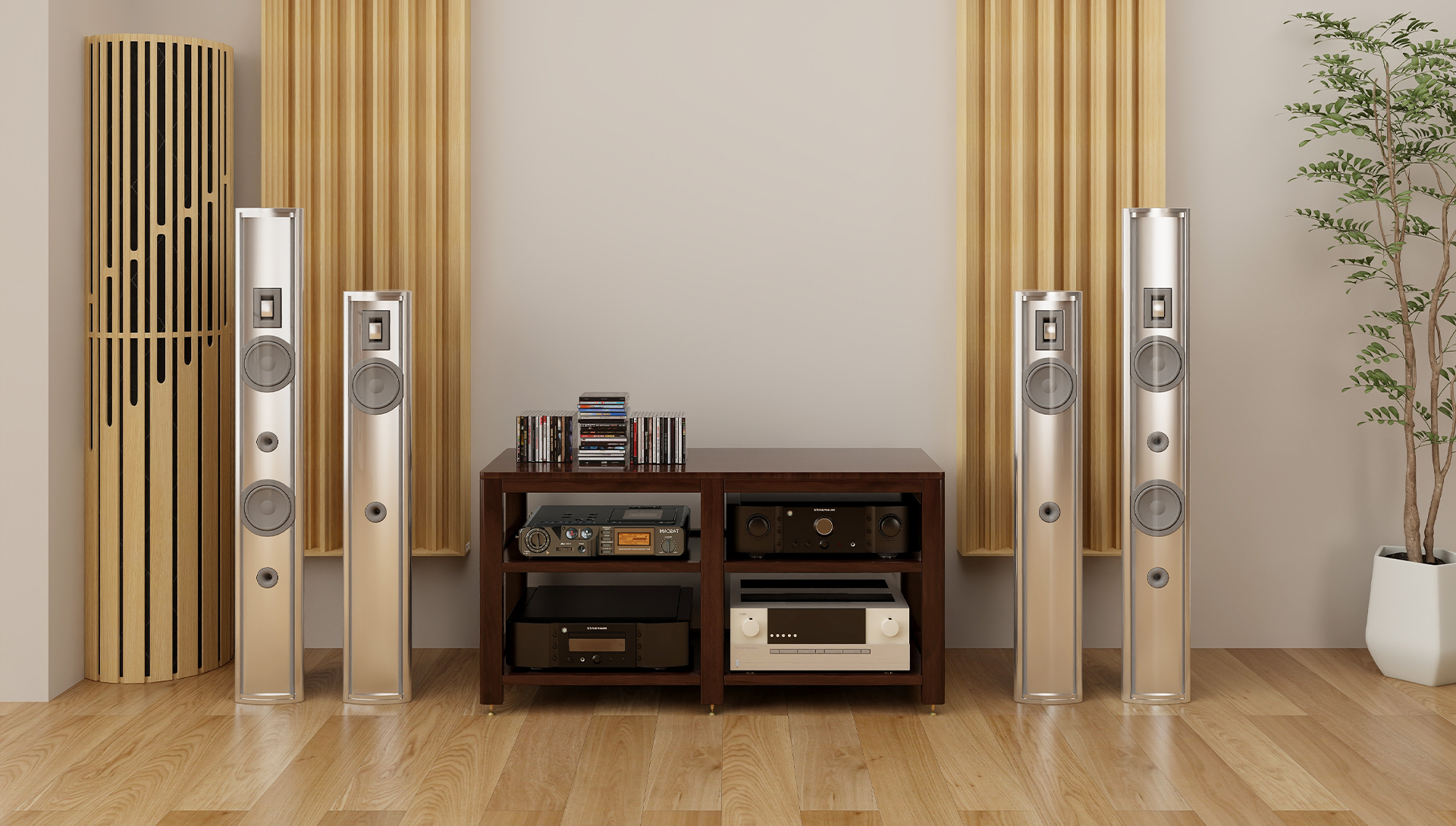 采用北美黑胡桃木,底座预埋螺母,使用适用避震脚钉设计,有效抑制共振,杜绝对音质的干扰,是发烧友的等级装备,给发烧友的音乐一角,简约的元素演绎现代生活,打造年轻人喜爱的家居。